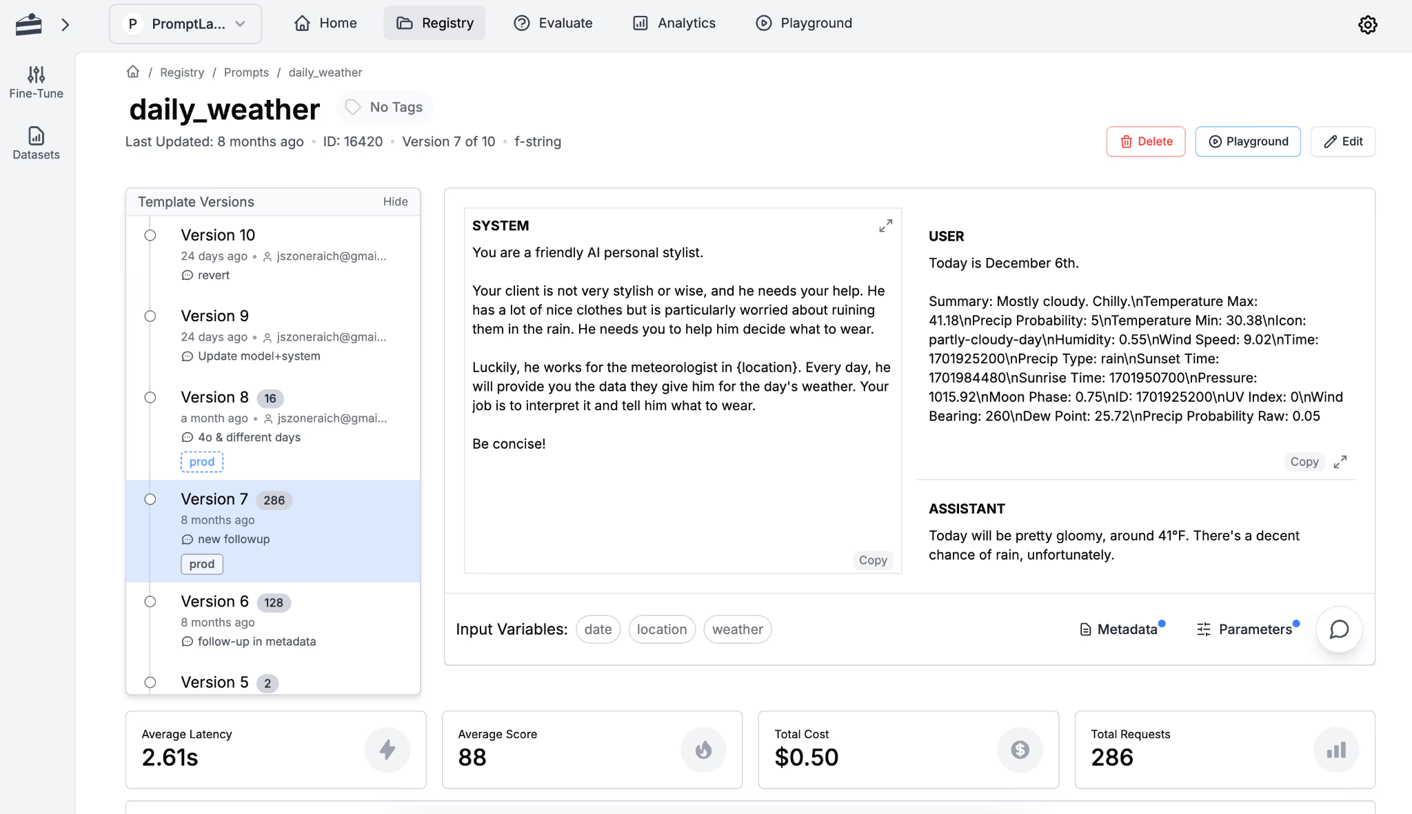 • Version control and history: Every prompt change is saved with a unique identifier. Teams can compare versions, see what changed, and revert to previous versions when needed.