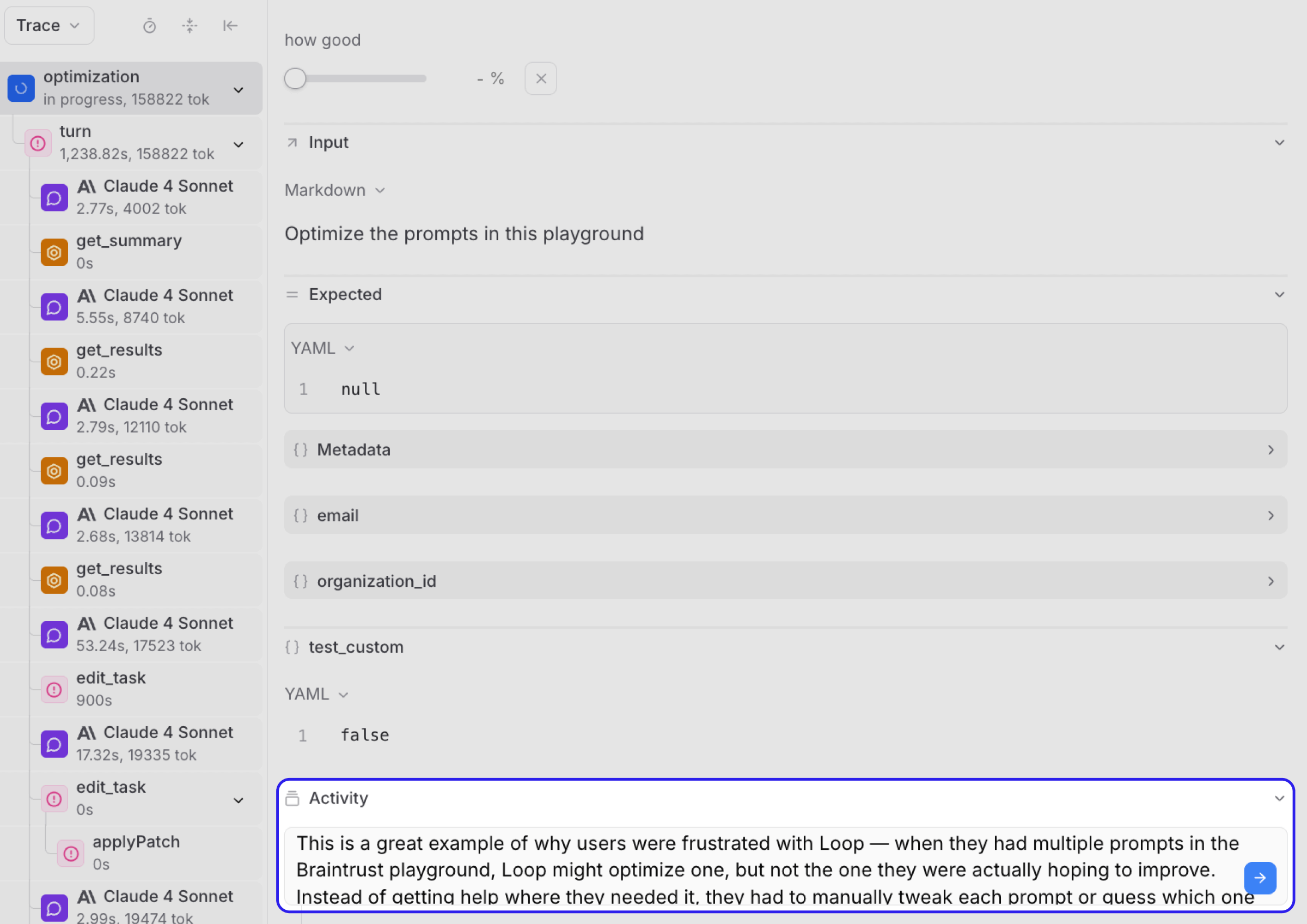 Here's where the story gets meta: we used Loop (running in Braintrust) to optimize Loop's own prompts. In the playground, we created a new session and fed Loop the dataset of problematic conversations, complete with playground metadata.